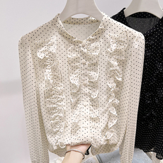 2025新款法式气质圆领木耳边镶钻单排扣长袖雪纺衬衫女春薄款上衣