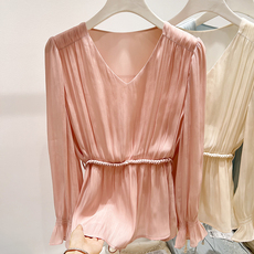 2025雪纺女上衣长袖气质打底衫超仙洋气v领喇叭袖荷叶边飘带衬衫