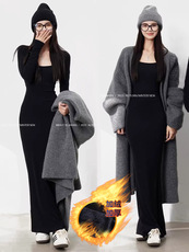 【270克棉磨毛】黑色扭结v领针织连衣裙女长袖纯欲中长款裙子