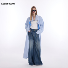 LEDIM WANG蓝白条纹风衣女2026春季新款海军风长袖撞色长款外套