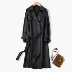 100%桑蚕丝香云纱中长款气质风衣女长袖黑色宽松外套时尚女士收腰