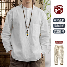 盘扣苎麻长袖国潮复古棉麻衬衫男中国风青年休闲立领宽松亚麻衬衣