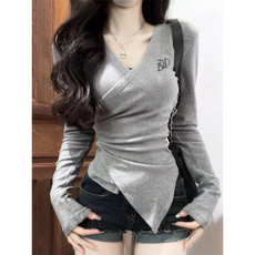不规则v领收腰长袖t恤女秋冬2025新款辣妹修身显瘦设计感内搭上衣