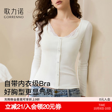 拉夏贝尔蕾丝花边V领打底衫女秋季修身掐腰长袖T恤时尚设计感上衣
