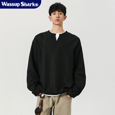 Wassup Shark美式假两件V领长袖T恤男新款百搭休闲宽松华夫格卫衣