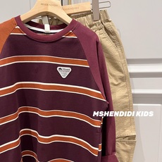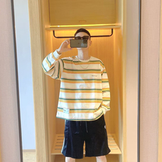 美式重磅条纹卫衣男潮牌宽松长袖网红爆款小领口收腰t恤个性百搭