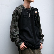 日系复古百搭迷彩拼接袖秋季百搭薄款长袖卫衣男青年宽松T恤衫潮