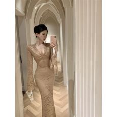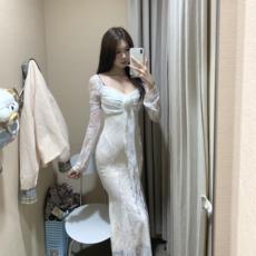 2025新款性感纯欲v领蕾丝长袖连衣裙子女早秋季修身掐腰包臀长裙