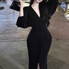 针织连衣裙女轻奢高级感法式V领单排扣修身包臀性感开叉打底长裙