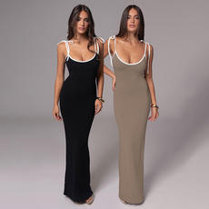 欧美风2024秋季时尚性感吊带长裙无袖系带包臀修身连衣裙单件