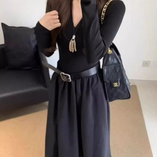 2025新款V领绑带长袖针织连衣裙子女秋装修身显瘦气质长裙包臀裙