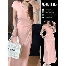 气质灰色方领t恤连衣裙子女夏季茶歇法式小个子修身收腰包臀长裙