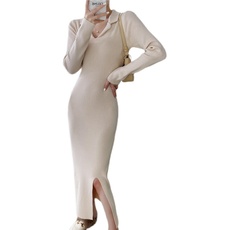 实拍纯欲风性感修身显瘦翻领长袖针织包臀鱼尾连衣裙长裙