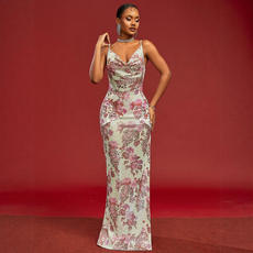 度假风水彩吊带连衣裙女夏季网纱长裙修身鱼尾裙纯欲收腰包臀裙子