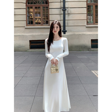 【清仓】法式方领长袖连衣裙春夏新款气质长裙修身包臀鱼尾裙