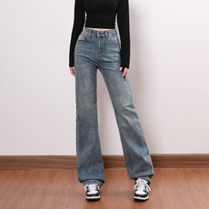 艾格正品高腰直筒牛仔裤女宽松显瘦百搭拖地长裤复古休闲女裤秋季