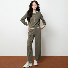 小吉家大码女装秋季慵懒风美式撞色条纹长袖内搭背心休闲长裤套装