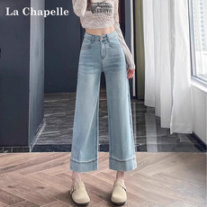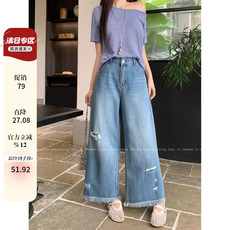 KZH真维斯港风牛仔裤女夏季新款宽松阔腿裤花边高腰休闲九分裤子