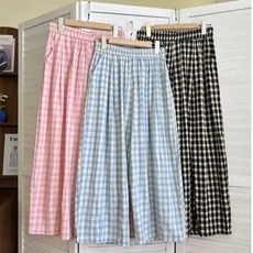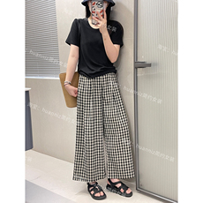复古格子休闲裤夏季高腰薄款棉麻九分阔腿裤显瘦遮肉慵懒风裤子女