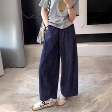 洋气木耳花边牛仔阔腿裤夏季薄款松紧腰宽松垂感九分直筒裤女
