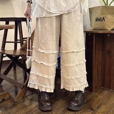 欧货木耳花边拼接条纹阔腿裤女夏季时尚百搭显瘦休闲九分老爹裤潮