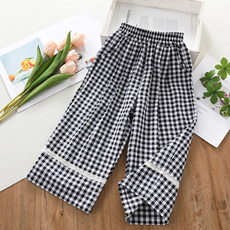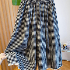 大码胖妹妹蕾丝花边格子阔腿裤女夏季新款宽松九分裙裤直筒休闲裤