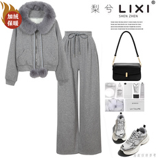 专柜同款韩版显瘦毛毛领连帽长袖卫衣阔腿裤两件套休闲加绒套装裤
