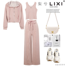 专柜同款秋新款休闲运动套装连帽卫衣背心阔腿长裤三件套套裤显瘦