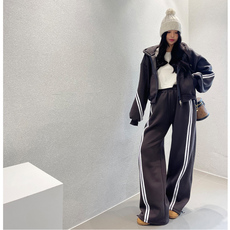 韩国代购女装2025冬款加绒条纹连帽拉链短款外套+阔腿裤潮人套装