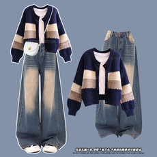 英国DGKP大码春秋季针织毛衣套装女宽松开衫高腰牛仔阔腿裤两件套
