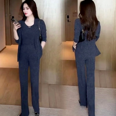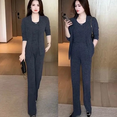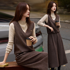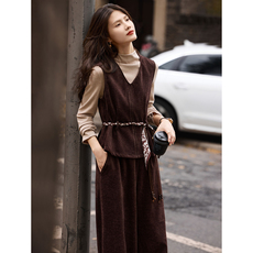 苏醒的乐园知性风三件套秋冬针织套头衫配腰带马甲阔腿长裤套装