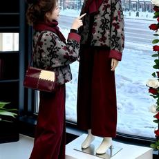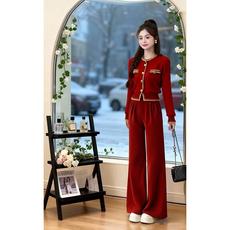 正品高货2025秋冬季潮流百搭圆领小花外套高腰阔腿直筒裤时尚套装