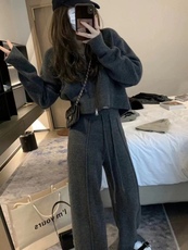 正品连帽短款毛衣长裤针织套装女年秋冬新款休闲开杀阔腿裤两件套