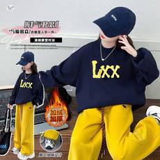 官方正品女童加绒套装2025年秋冬新款撞色印花卫衣阔腿裤两件套中