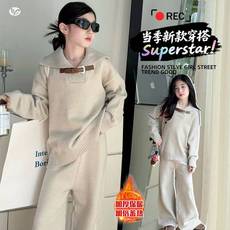 正品华绒套装!秋冬双层领假两件宽松显瘦休闲运动女士上衣阔腿裤