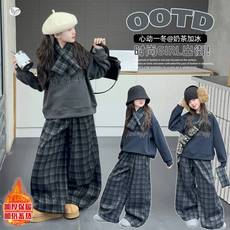 官方正品女童秋冬套装2025年新款字母卫衣格子围巾加绒阔腿裤三件