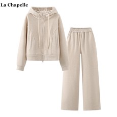 拉夏贝尔/La Chapelle秋冬加绒加厚连帽卫衣高腰阔腿裤时尚套装女