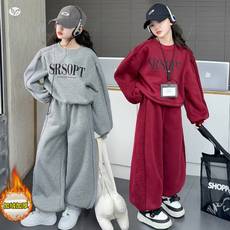 官方正品女童秋冬加绒套装2025年新款中大童印花卫衣阔腿裤两件套