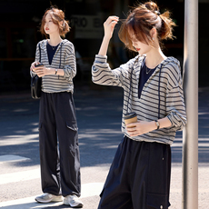 苏醒的乐园两件套秋季条纹连帽撞色假两件卫衣工装阔腿长裤套装