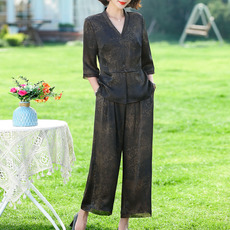 红云纱套装高端品牌香云纱上衣女妈妈夏装桑蚕丝真丝阔腿裤两件套
