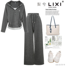 专柜同款秋新款舒适显瘦休闲带帽卫衣阔腿长裤两件套运动套装裤子