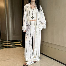 老钱风条纹棉绸套装女春夏季薄款长袖开衫三件套装阔腿裤防晒套装