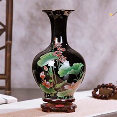 景德镇陶瓷器乌金釉荷花图插花小花瓶中式家居客厅装饰工艺品摆件