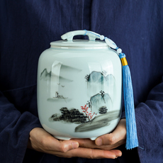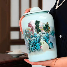 手绘青瓷山水茶叶罐一斤装茶罐家用防潮红茶绿茶储茶罐陶瓷密封罐