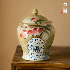 粗陶手绘花卉茶叶罐密封罐茶饼景德镇陶瓷中式家用手工茶罐存储罐