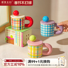 摩登主妇格纹马克杯带盖杯子情侣水杯家用陶瓷杯高颜值早餐咖啡杯
