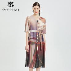 马天奴新款印花雪纺圆领系带收腰连衣裙宽松长裙灯笼袖裙子