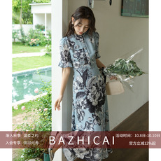 芭知彩印花雪纺连衣裙中长款大码复古优雅气质超仙蓝色淑女裙