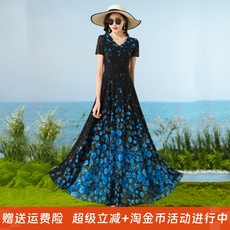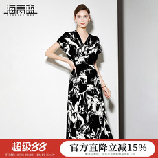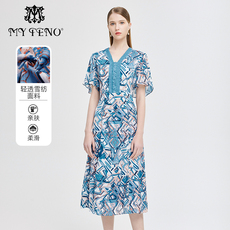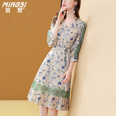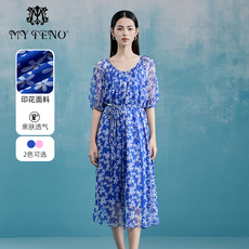 马天奴秋季蓝色V领印花雪纺连衣裙短袖高腰气质长裙流行裙子
