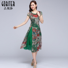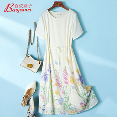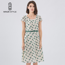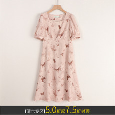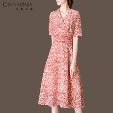 M2女装品牌折扣春夏中年妈妈收腰显瘦大码雪纺印花短袖连衣裙